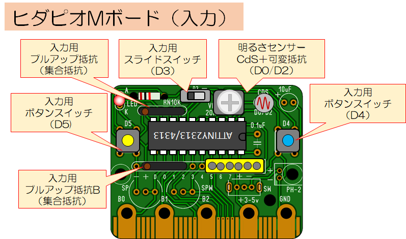○光センサーと各種スイッチが搭載できます。B0〜B2、D6に入力用プルアップ抵抗Bをつけることも可能です。