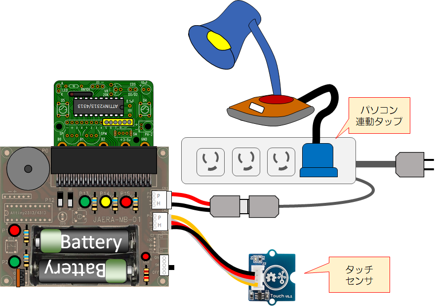 ・下図はB0とGNDにUSBケーブルをつなぎ、パソコン連動タップで家電製品を制御します。
