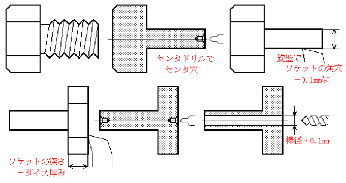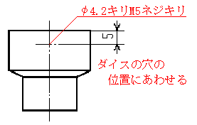 ・ソケットの加工は、φ4.2 のドリルで穴あけをした後、M5のねじ切りを2ヶ所おこないます。ソケットレンチは薄くまた硬いので、タップはまっすぐたて、油を差しながらていねいにネジキリしなければなりません。
