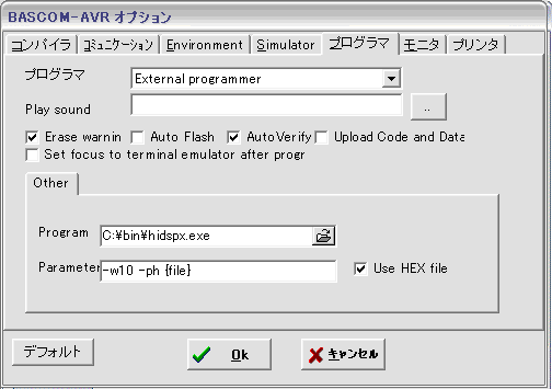 - AVRライタソフトウェアの設定をhidspx.exe用に変更する。