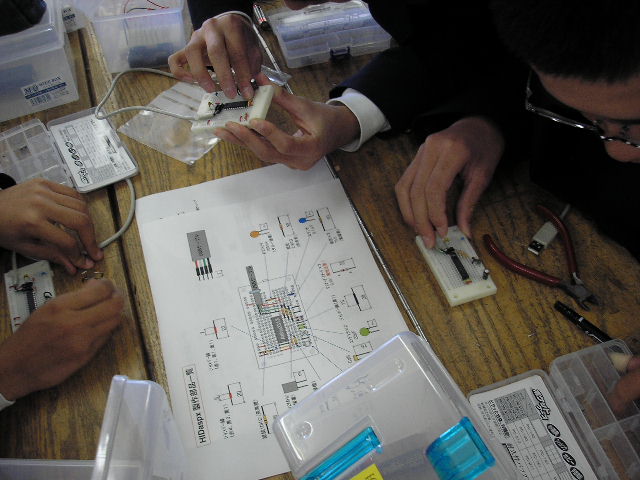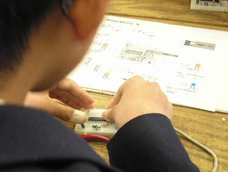 - ●光センサ(CdS)とLED8個の点滅制御のためのプログラミング実習