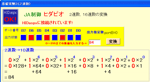 「JA制御 ヒダピオ」の2進数変換の画面