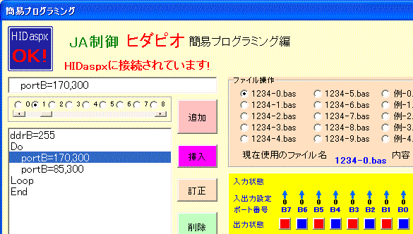 「JA制御 ヒダピオ」の簡易プログラミングの画面