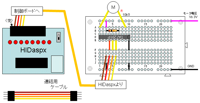HIDaspxの「+」印とブレッドボード赤のジャンパー線を目安に接続する。