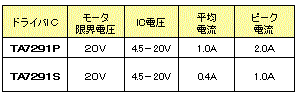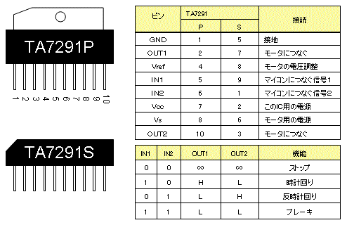 ここでは入手しやすく、ブレッドボードでも使いやすい モータドライバIC TA7291P を使用する。