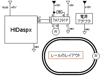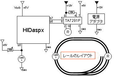 ポイント切り換え信号として、HIDaspxからポイント焼損防止マイコンのb7ポートに信号が入ると、今の反対側にポイントを切り替えるように0.01秒間だけ電流を流し、0.5秒間待ち、その後、信号が反転するまで受け付けない。