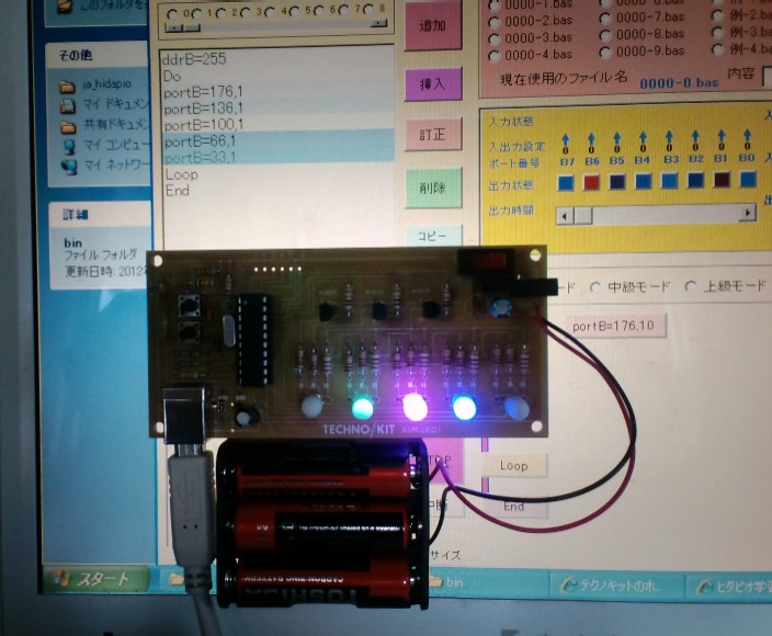 - (1)「ヒダピオ学習回路」(HIDaspx+8LED+CdS)をパソコンのUSBポートにつなぐ