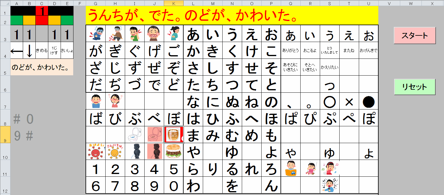使用法の動画 エクセルの中で、ボタンスイッチ5個(2個…移動、1個決定、1個修正、1個リセット)を使って文章を打ち込むシステムです。