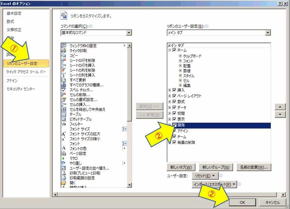 (1)VBAが扱えるよう、リボンに「開発」リボンを追加する。